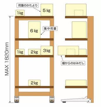 経年変化での、棚受け・棚板・柱の変形・ビスの緩みがないか定期的に確認してください。