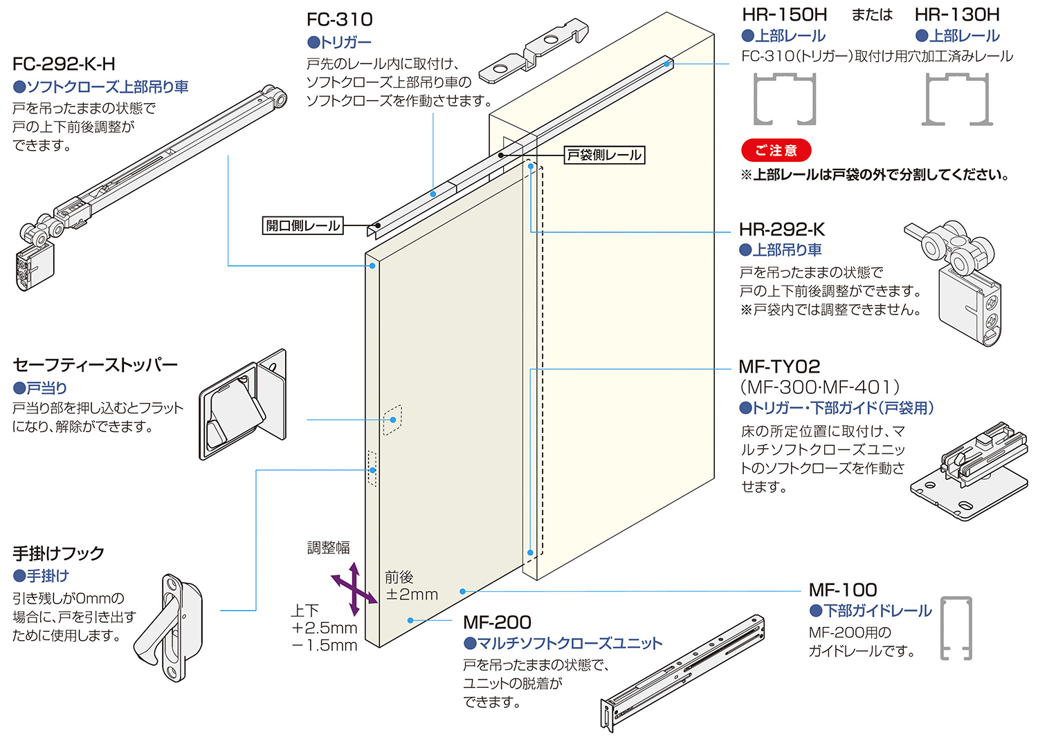 ●戸先下部の「マルチソフトクローズユニット」は、戸を吊ったままでユニットの脱着が可能で、メンテナンス性に優れています。