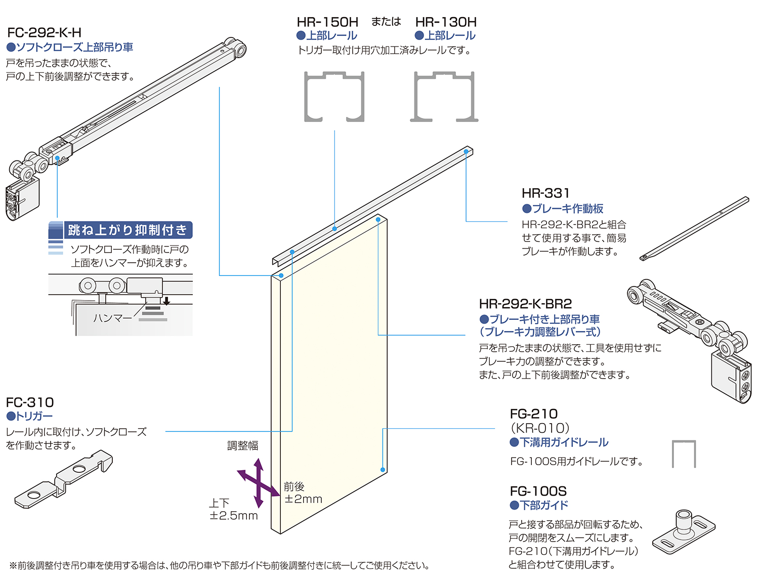 ※ブレーキ付き上部吊り車は、引戸の速度抑制機能付きの吊り車です。
